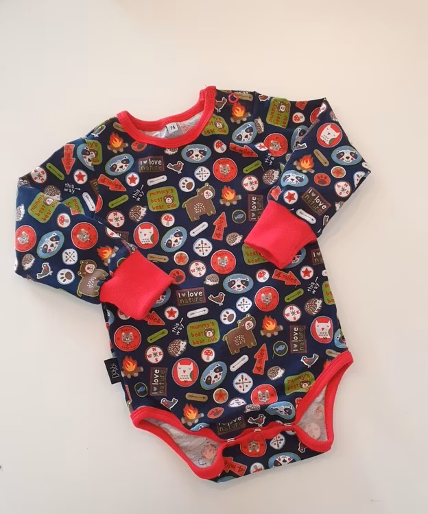 Body 200 kr Stl 74 Lägg i korgen Mörkblå body med små djur och naturmärken. Röda muddar och röda nickelfria tryckknappar. Knäppning på ena axeln