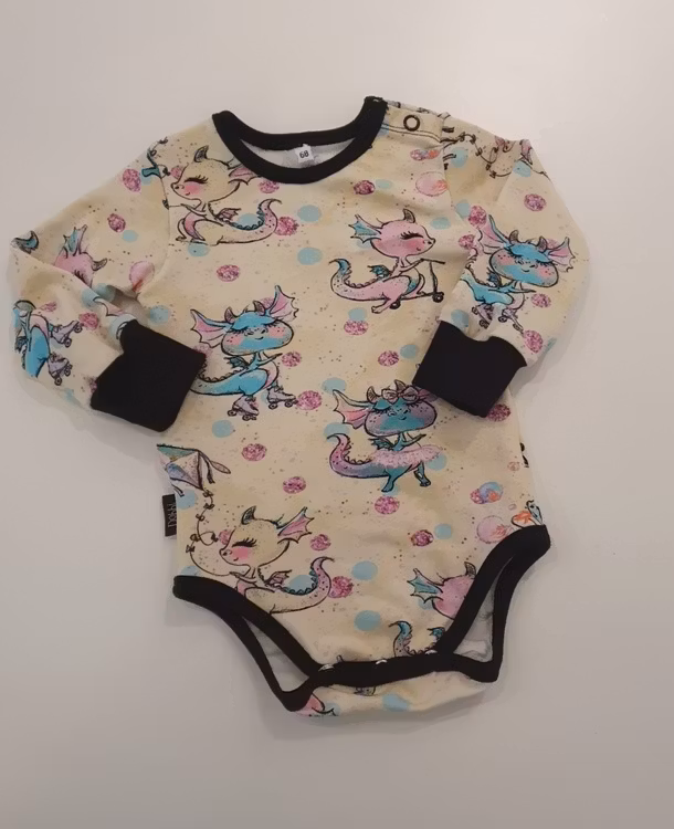 Body 150 kr Stl 68 Lägg i korgen Ljusgul body med drakar. Knäppning på ena axeln. Nickelfria tryckknappar.