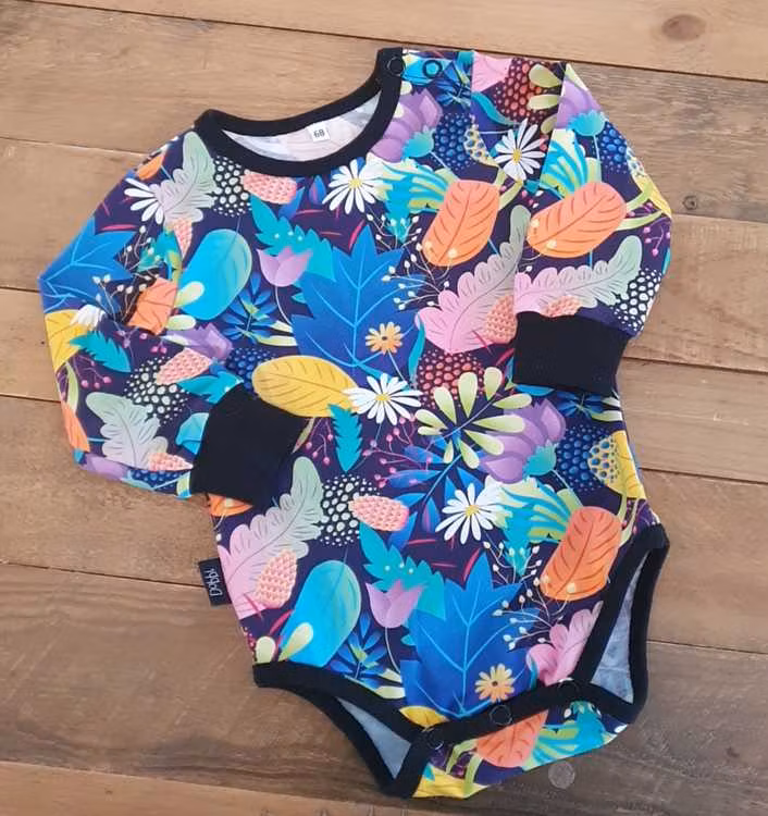 Body 200 kr Stl 68 Lägg i korgen Body med blommor och blad. Knäppning på ena axeln. Nickelfria tryckknappar