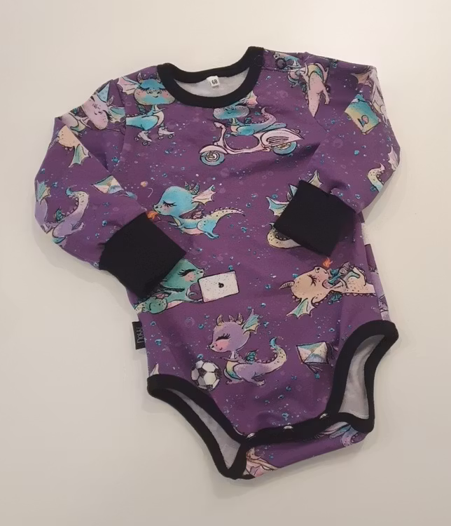 Body 150 kr Stl 68 Lägg i korgen Lila body med drakar. Knäppning på ena axeln. Nickelfria tryckknappar