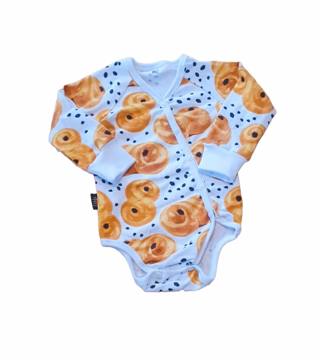 Body 200 kr Stl 56 62 68 Lägg i korgen Vit body med lussebullar. Knäppning hela framsidan, nickelfria tryckknappar