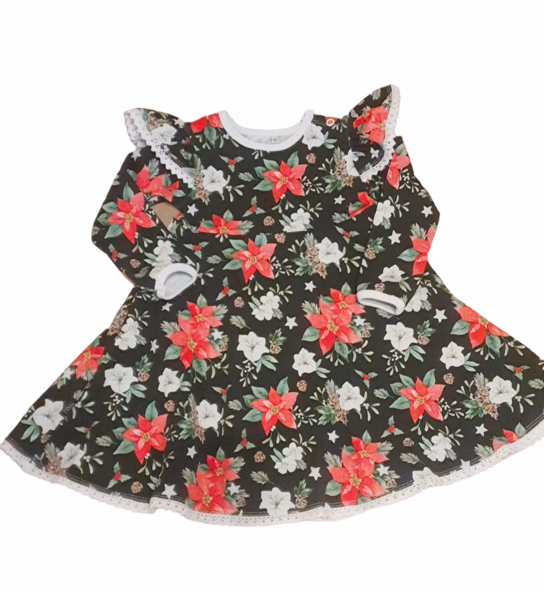 Klänning 320 kr Stl 92 Lägg i korgen Mörkgrön klänning med blommor. Vingärm och knäppning på ena axeln, nickelfria tryckknappar