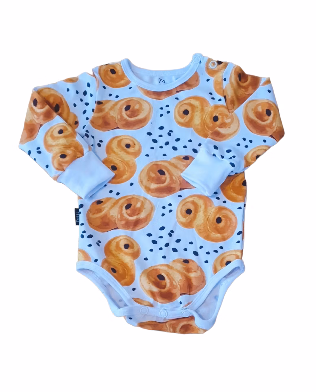 Body 200 kr Stl 62 68 74 Lägg i korgen Vit body med lussebullar. Knäppning på ena axeln, nickelfria tryckknappar