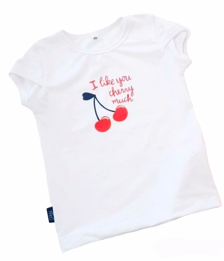 T-shirt 200 kr Stl 80 86 92 98 104 110 Lägg i korgen Vit t-shirt med omlottärm. Tryck på bröstet. "I like you cherry much"